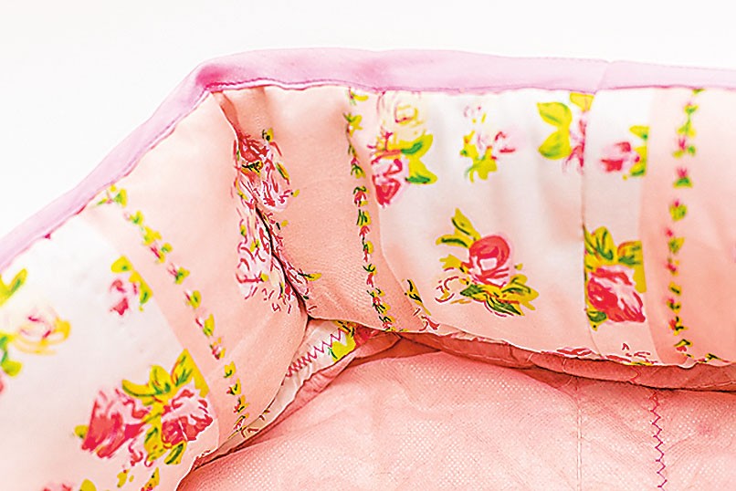 На деталь дна с помощью горячего утюга наклей флизелин. По средней горизонтальной линии бортика проложи декоративную косую бейку (фото 1). Затем стачай вертикальный шов бортика и прострочи в нем карманы, не доходя до нижнего края примерно 1,5–2 см (припуск на соединительный шов с дном).