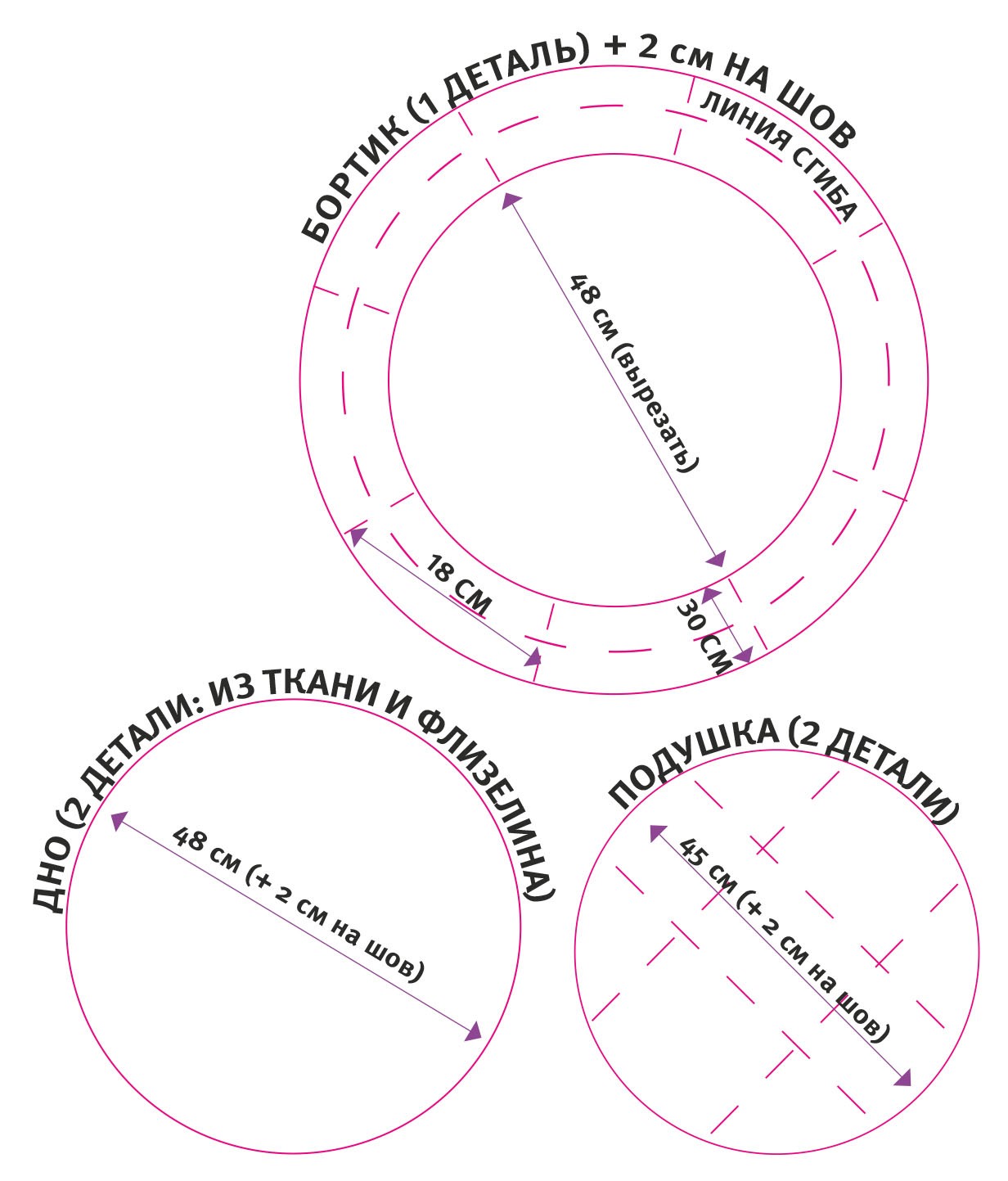 Увеличь и вырежь выкройки. Положи выкройки на ткани с учетом количества необходимых деталей: дно – 1 шт., бортик – 1 шт. из ткани, 1 шт. из флизелина, подушка – 2 шт. Аккуратно выкрои все детали с учетом припусков на швы (1,5–2,0 см).