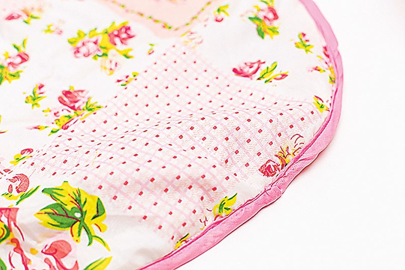Между двумя деталями подушки проложи синтепон и простегай их так, как показано на выкройке. Затем внешнюю окружность подушки обработай косой бейкой (фото 3).