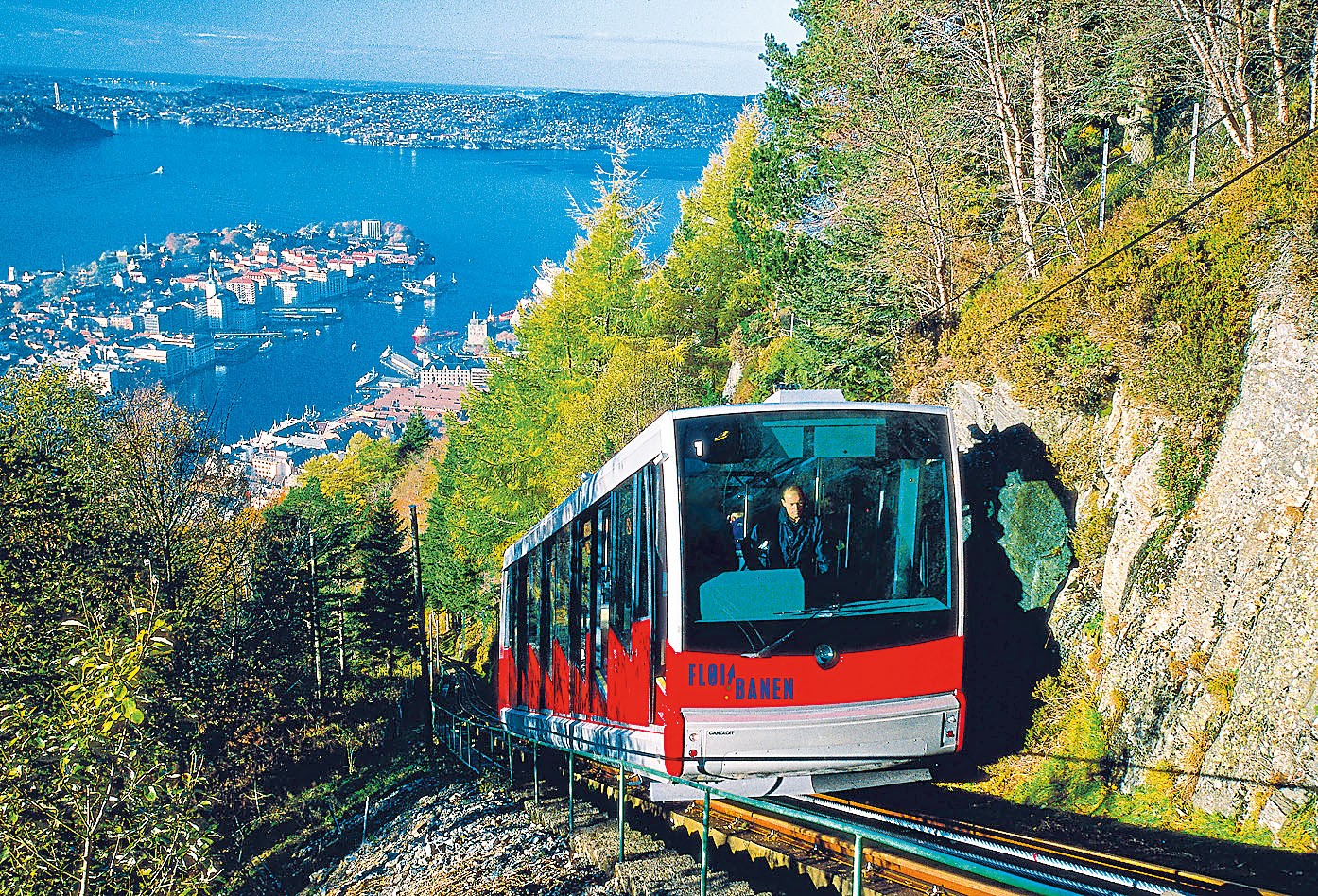 После подкрепления время покорять вершины. Нет, забираться пешком на гору Флёйен мы не стали, воспользовались фуникулером. Наверху, с высоты 320 м, можно полюбоваться и Бергеном, и горами, и фьордами. Кстати, у каждого вагончика фуникулера есть свое имя. Мы ехали в «Красной Шапочке».