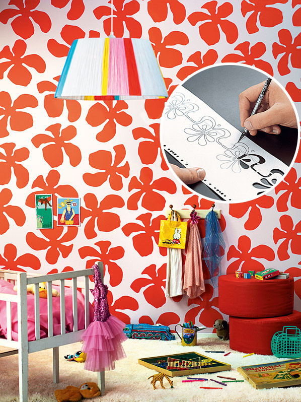 Это самый быстрый и удобный способ декорирования интерьера. Рисунки на стенах, бордюры или большие изображения от пола до потолка, которые размещают симметрично или в произвольном порядке, становятся частью интерьера и вполне способны заменить картины и другие элементы дизайна. Так, бордюр по периметру комнаты придаст целостность ее оформлению. Изображение станет более естественным, если применять несколько разных цветов, размещать элементы в несколько слоев или частично накладывать их друг на друга.