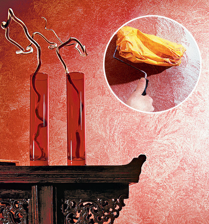 Одна из простейших техник – декорирование специальным валиком. Этот инструмент оставляет на окрашиваемой поверхности оригинальные узоры. Необычный эффект усилят фоновая и декоративная краски разных оттенков. Цвет на стенах буквально оживает, создавая иллюзию трехмерного пространства. Работать удобнее вдвоем: один наносит фоновую краску на стену, второй декорирует поверхность валиком. Не забывай периодически очищать валик, прокатывая его по чистому листу картона или обтирая влажной тканью. Кстати, шубку для валика можно изготовить самостоятельно, например, обернув обычный валик тканью.