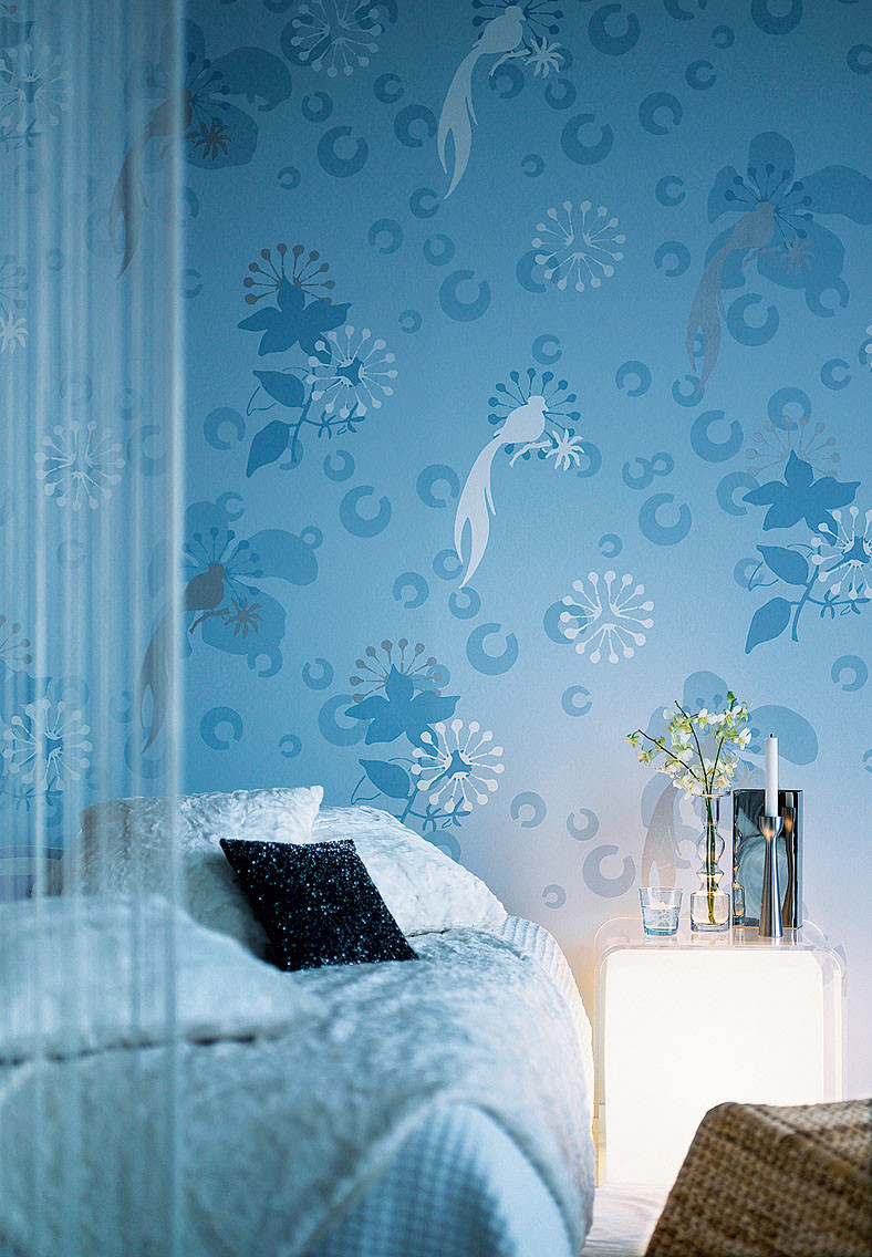 Такой эффект поможет создать регулярно повторяющийся орнамент. Это одна из самых сложных техник декорирования по трафарету, но результат стоит усилий и потраченного времени. Выбор оттенков, последовательное повторение элементов: цветов, птиц, бабочек – требуют аккуратности и сосредоточенности, неукоснительного следования вертикальной и горизонтальной разметкам. Выбирая краску, учитывай, что лампы накаливания заметно приглушают холодные цвета и усиливают теплые.