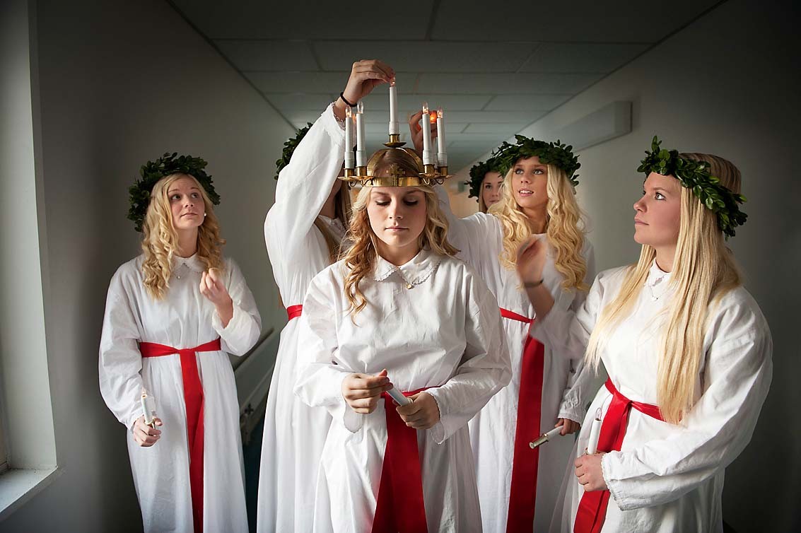 Череду зимних праздников открывает День Святой Люсии (13 декабря), покровительницы света. В честь нее во многих уголках страны устраивают шествие. Возглавляет парад виновница торжества, роль которой обычно доверяют самой красивой девушке города. Она облачается в белые одежды и несет корону из зажженных свечей (вместо них электрические лампочки). В свите Люсии – так же одетые в белое девочки и мальчики, а часть – в костюмах пряничных человечков и гномов. Вся процессия несет в руках свечи, поет гимны и угощает прохожих имбирным печеньем и булочками с шафраном.