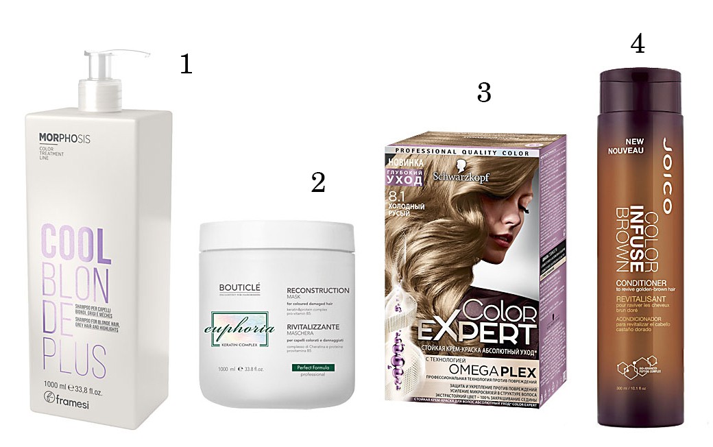 1. Шампунь для холодных оттенков светлых и седых волос COOL BLONDE SHAMPOO Framesi. 2. Восстанавливающая маска Bouticle. 3. Cтойкая крем-краска Color Expert с профессиональной технологией OMEGAPLEX против повреждений Schwarzkopf. 4. Тонирующий шампунь Color Infuse Brown Joico.