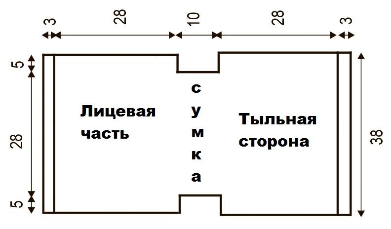 Описание работы: все вяжется одним полотном. Для тыльн. части на спицы белой нитью в 2 сложен. набрать 82 петли и для планки связать 16 рядов (= 3 см) двойн. резинкой. Продолжить работу так: 15 п. резинкой 3/3, 14 п. «косой» А, 24 п. большой «косой», 14 п. «косой» В, 15 п. резинкой 3/3. Через 7 см от планки (= 18 рядов) связать следующ. 26 рядов, соединив 1 белую нить и 1 бежевую нить, затем связать еще 26 рядов бежевой нитью в 2 сложения (= 28 см от планки). Закончив вязать тыльн. часть сумки, вязать дно так: закрыть с обеих сторон по 10 петель и на оставшихся 72 петлях вязать изнан. гладью; через 10 см, закончив вязать дно, с обеих сторон набрать дополн. по 10 петель и вязать лиц. часть сумки так: 15 п. резинкой 3/3, 14 п. «косой» А, 24 п. большой «косой», 14 п. «косой» В, 15 п. резинкой 3/3. Через 26 рядов от начала вязания лиц. части связать следующие 26 рядов, соединив 1 белую нить и 1 бежевую нить, затем еще 18 рядов белой нитью в 2 сложения (= 28 см от дополнительно набранных петель). Для планки белой нитью в 2 сложен. связать 16 рядов (= 3 см) двойн. резинкой и закрыть петли трикотажн. швом.
