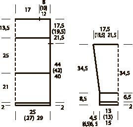 На спицы набрать 54 п. и связать 8 рядов резинкой, далее вязать платочной вязкой, равномерно убавив по 8 п. в 1-м ряду, 11 п. через 14 см от начального ряда и 12 п. через 16 см от начального ряда. Через 23 см от начального ряда отложить все петли и обрезать нить, оставив длинный конец нити. Протянуть конец нити через отложенные петли и стянуть; выполнить боковой шов.