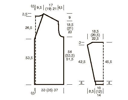 Спинка: в 3 нити на спицы №6 набрать 92 (98) 104 п. и вязать основным узором. Для пройм через 56 см = 98 р. (53,5 см = 94 р.) 51,5 см = 90 р. от наборного ряда с обеих сторон закрыть 1 х 1 п., затем в каждом 2-м р. закрыть 8 х 1 п. = 74 (80) 86 п. Для плечевых скосов через 74,5 см = 130 р. от наборного ряда с обеих сторон закрыть 1 х 3 п., затем в каждом 2-м р. закрыть 5 х 3 п. и 2 х 2 п. (7 х 3 п.) 5 х 3 п. и 2 х 4 п. Одновременно для выреза горловины через 80 см = 140 р. от наборного ряда закрыть средние 18 п. и обе стороны закончить раздельно. Для закругления выреза по внутреннему краю закрыть в каждом 2-м р. 2 х 2 п. Через 83,5 см = 146 р. от наборного ряда закрыть оставшиеся 2 (3) 4 п. плеч с каждой стороны.