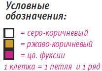 ■ пряжа (100% натуральной шерсти; 100 м/50 г) – 300 (350) 400 г серо-коричневой, 100 г ржаво-коричневой и 100 г цв. фуксии; ■ спицы №5,5 и 6.