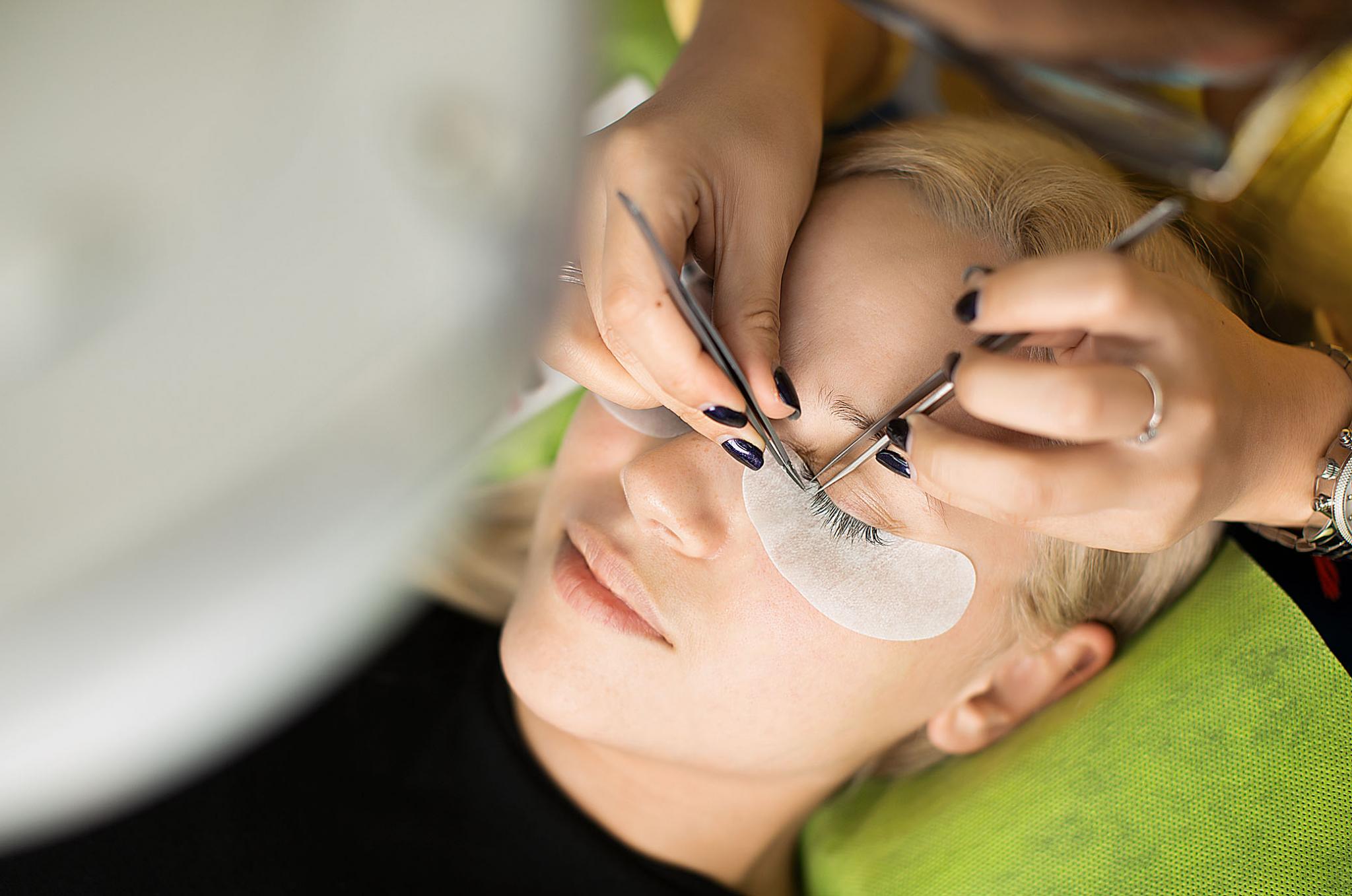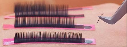2. Обмакивая край искусственной реснички в клей, мастер накладывает ее к твоей, отступая на 0,5–1 мм от века.