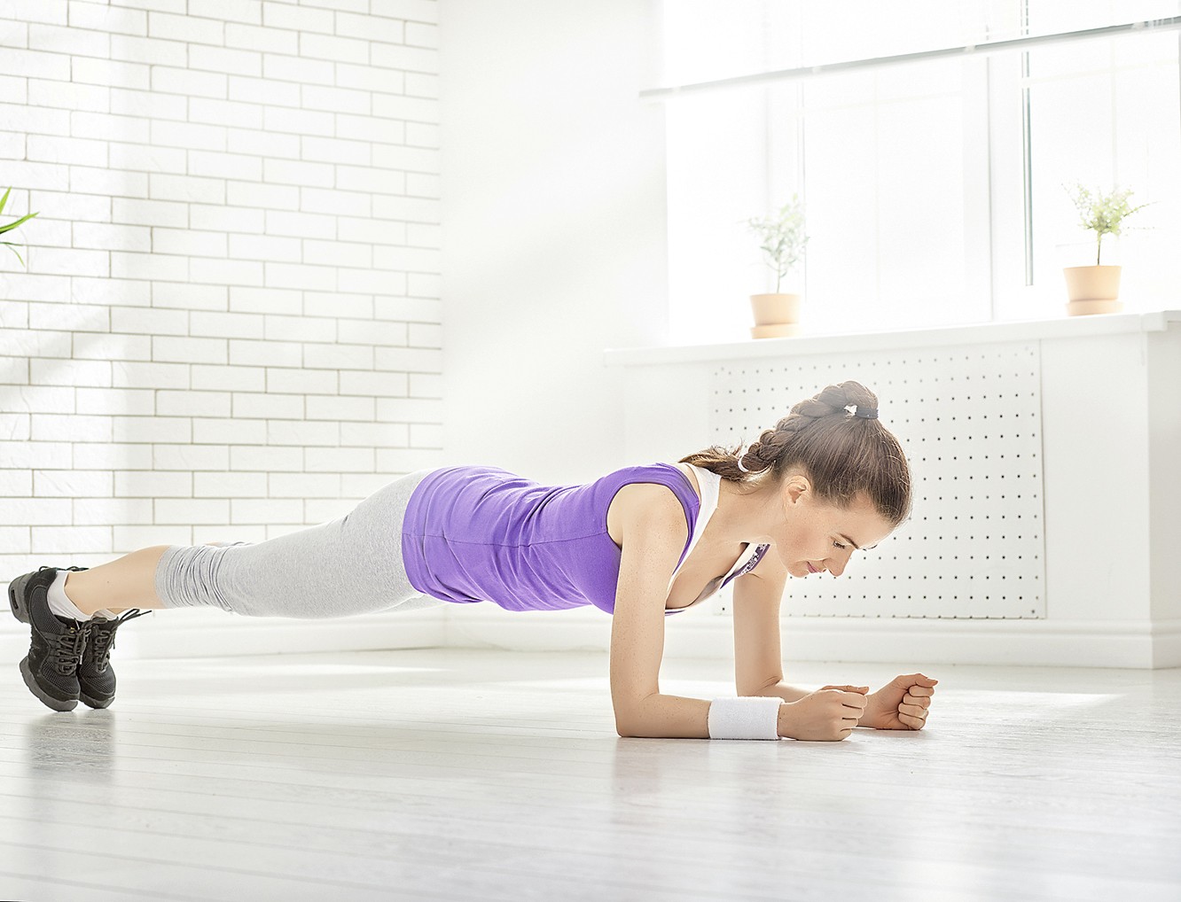 Это упражнение задействует все группы мышц. Главное при выполнении – удерживать тело так, чтобы оно составляло прямую линию. Прими упор лежа, опираясь на предплечья и пальцы стоп. Живот и ягодицы втяни. Держи планку 30 секунд.