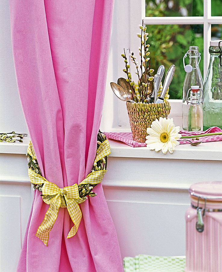 Подоконник на кухне – отличное поле для творчества, особенно с текстильными элементами. Прихвати штору декоративным веночком, увитым яркой лентой, на подоконник положи салфетку в тон – здравствуй, весна! Еще один вариант – повесить светлые мини-портьеры, что позволит весеннему солнцу беспрепятственно проникать в помещение весь световой день. Это не только удобно и практично, но и экономно: короткие шторы, как правило, дешевле классических.