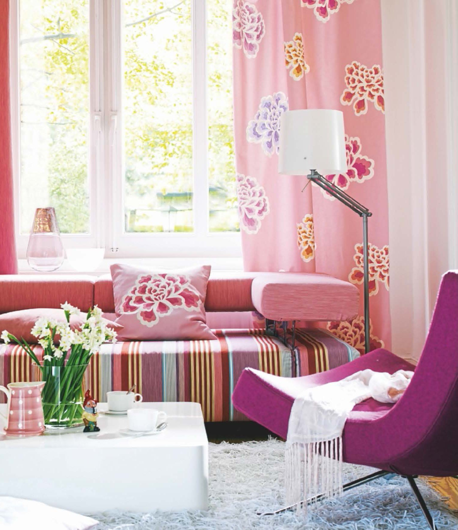 Стильное решение: крупные цветы на нежном персиковом фоне штор повторяются в других элементах декора, например, в расцветке подушек.