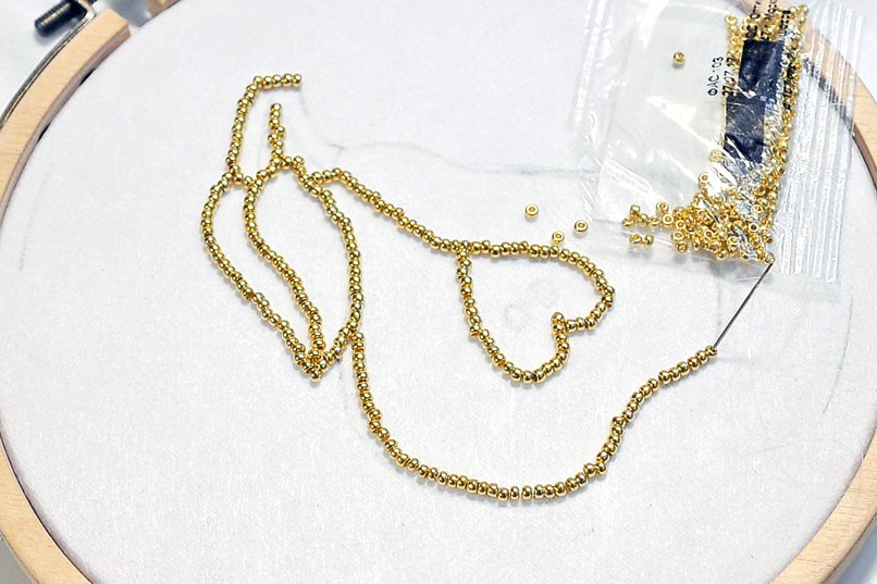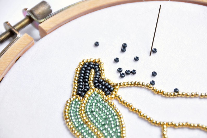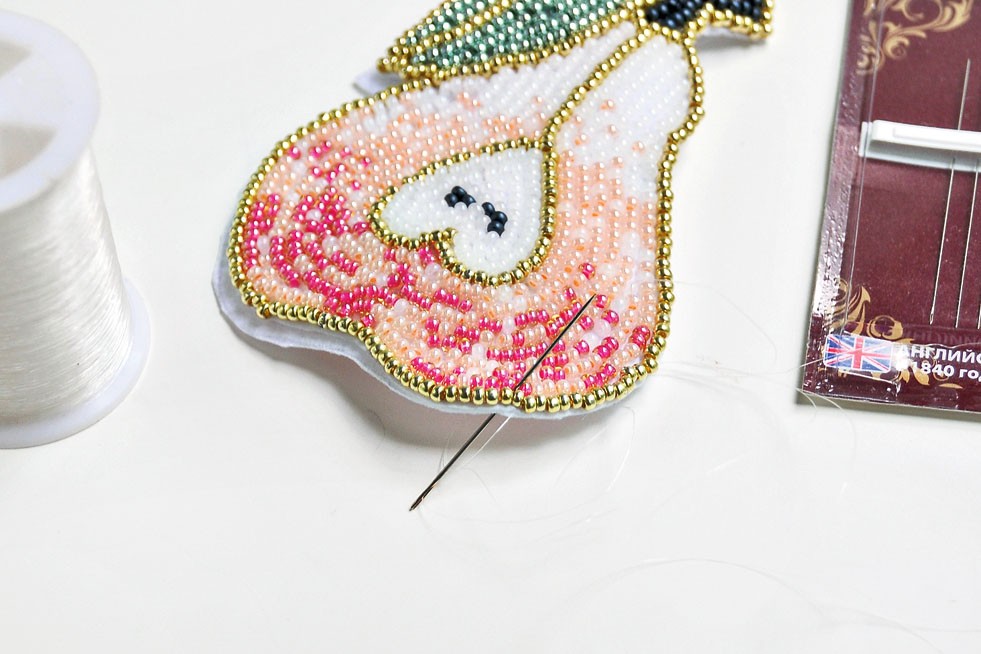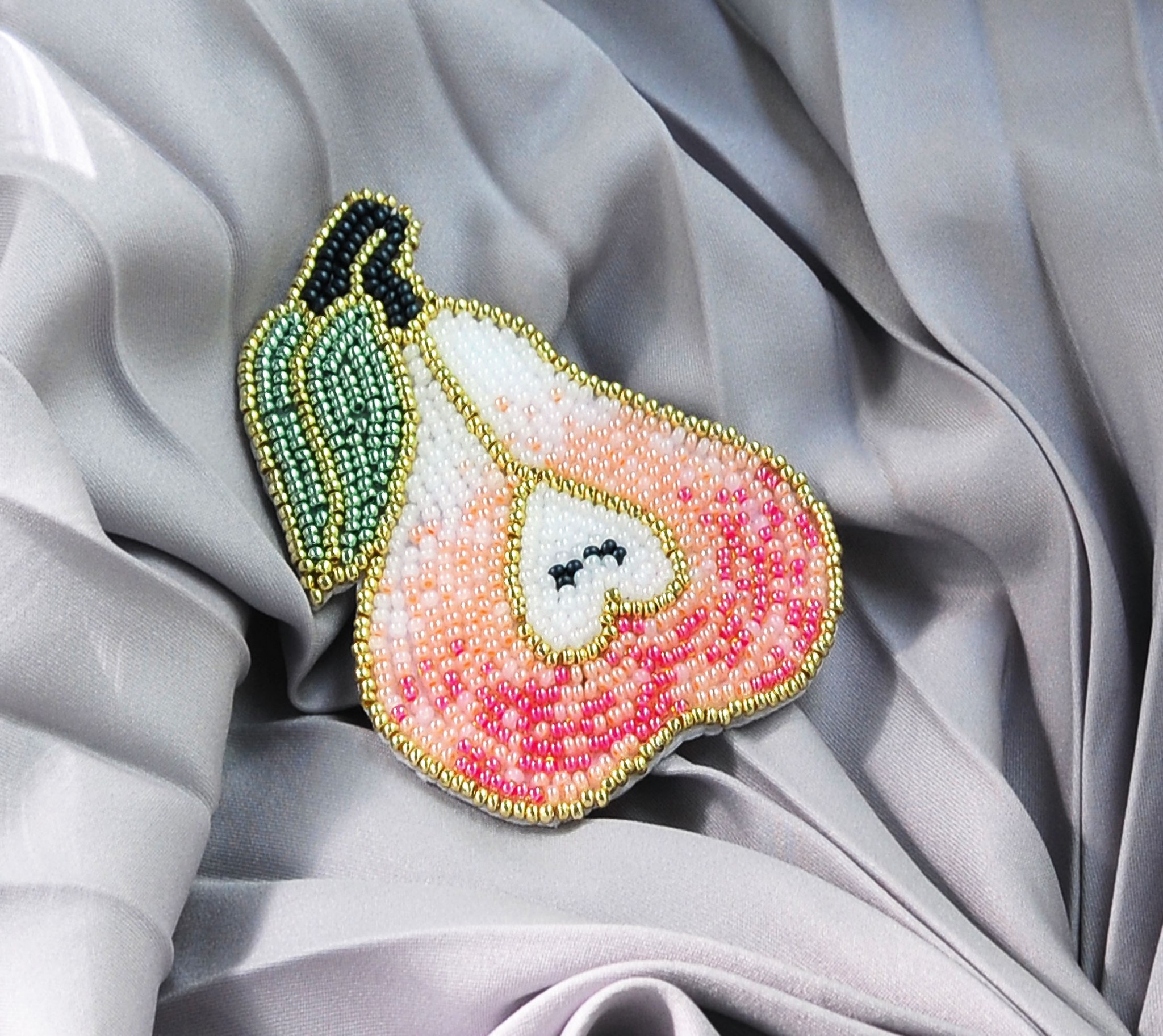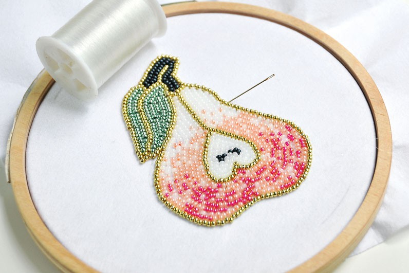 Белым бисером заполняем центральную часть груши, добавляя черный в качестве косточек. Оставшееся пространство заполняем бисером белого и розового цветов.