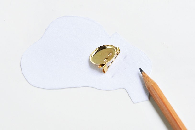 Вынимаем фетр из пялец, вырезаем грушу по контуру. Из белого фетра вырезаем еще один контур броши для задней части и отмечаем на ней места прорезей для булавки.