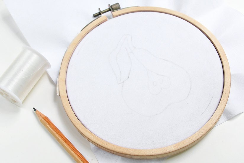 На бумаге рисуем контур груши, вырезаем и переносим с бумаги на фетр. Вставляем фетр в пяльцы.