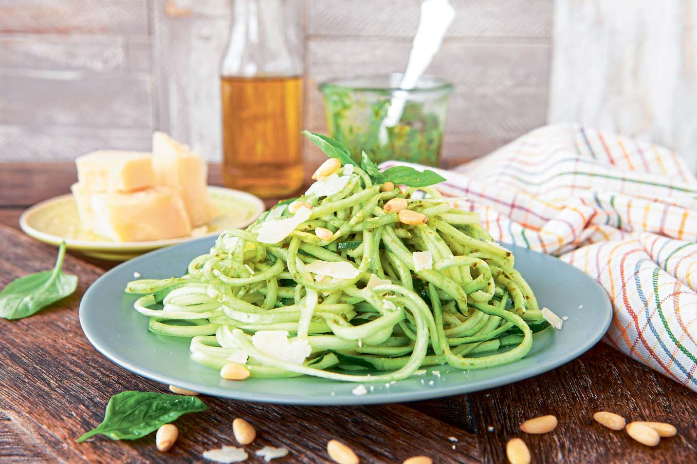 • 2 цукини • 2 чашки свежих листьев базилика • 2 ст. л. очищенных кедровых орешков • 1/4 стакана оливкового масла • 2 ч. л. лимонного сока • 1/4 стакана тертого твердого сыра • морская соль по вкусу