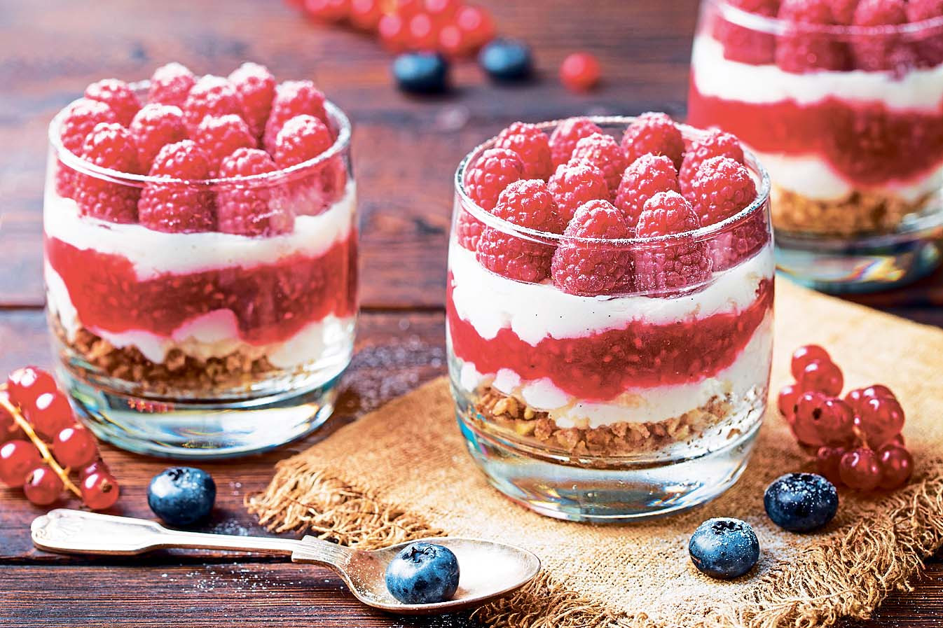 3. Разлей по креманкам и поставь в холодильник до застывания. Вторую часть желатина раствори в малиновом пюре. Залей творожную массу. Слои можно чередовать несколько раз.