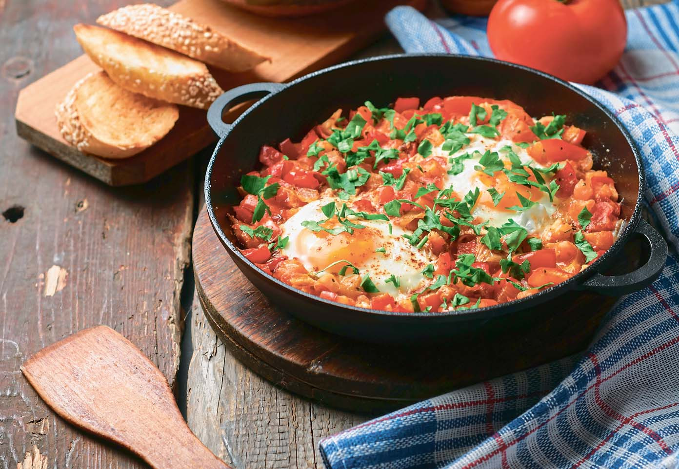2. Когда большая часть жидкости испарится, сделай ложкой 2 углубления в овощной основе и разбей туда яйца. Посоли. Готовое блюдо посыпь зеленью.