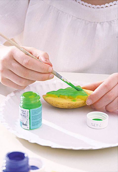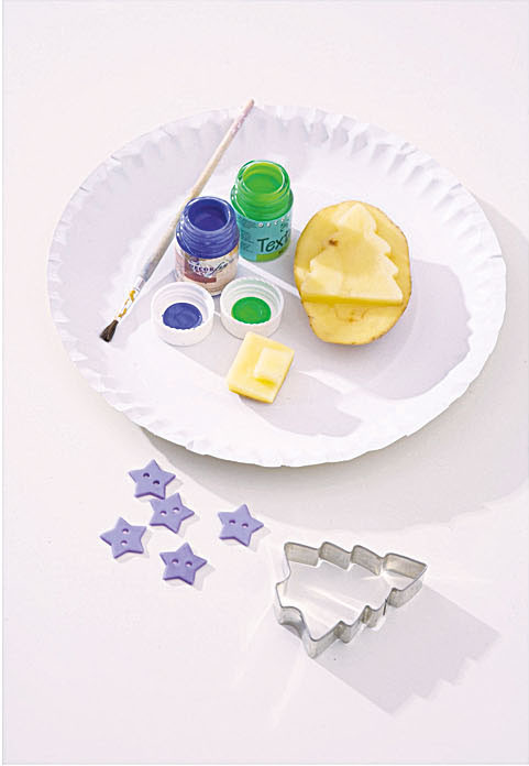 1. Сделай штампы. Разрежь картофелину пополам. Надави формочкой на срез, чтобы отпечаталась елочка.