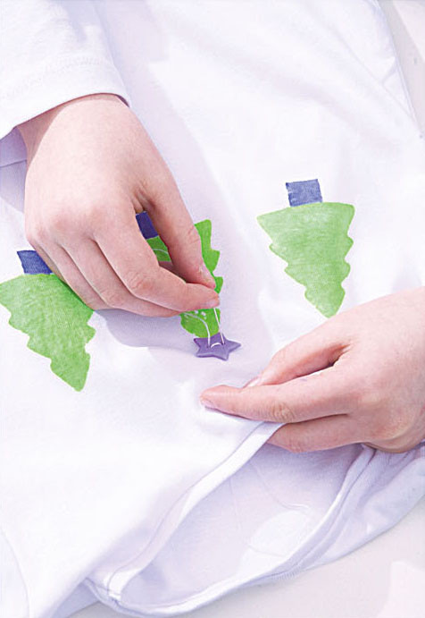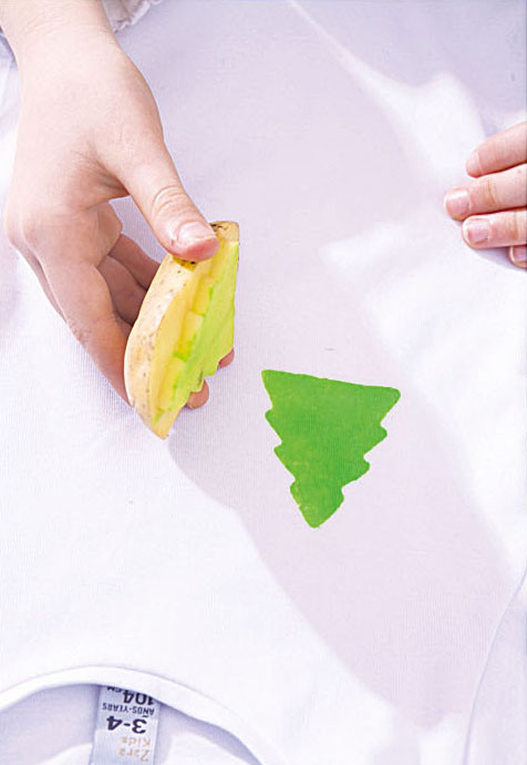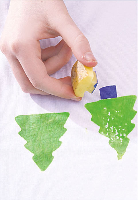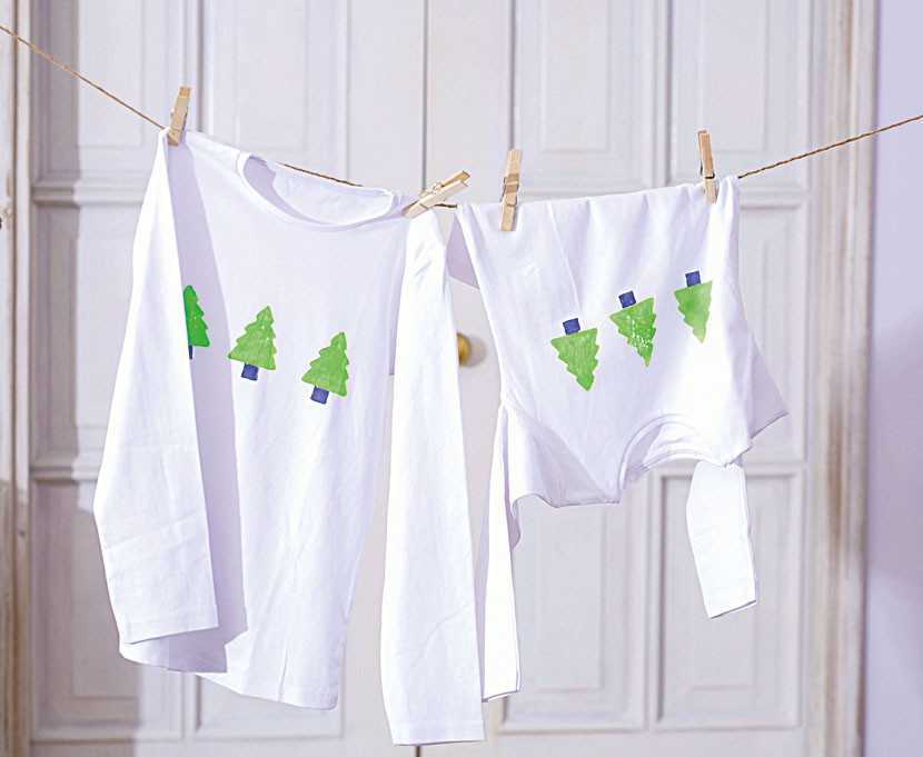 3. Нанеси краску. Кисточкой окрась елочку и ствол на штампах и отпечатай рисунок на ткани.