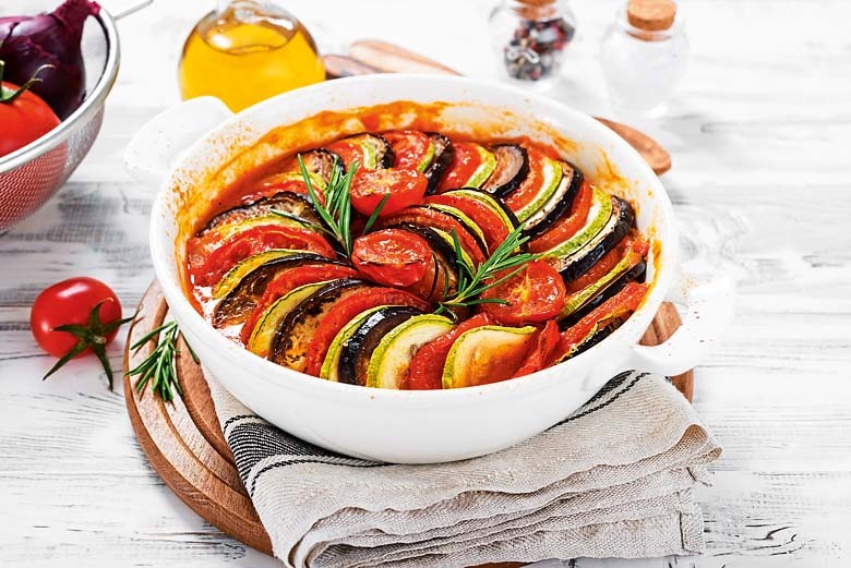Когда-то это блюдо было пищей крестьян. Мяса в нем нет, только овощи. Их нарезают кружочками, укладывают слоями и запекают. Важный ингредиент: прованские травы.