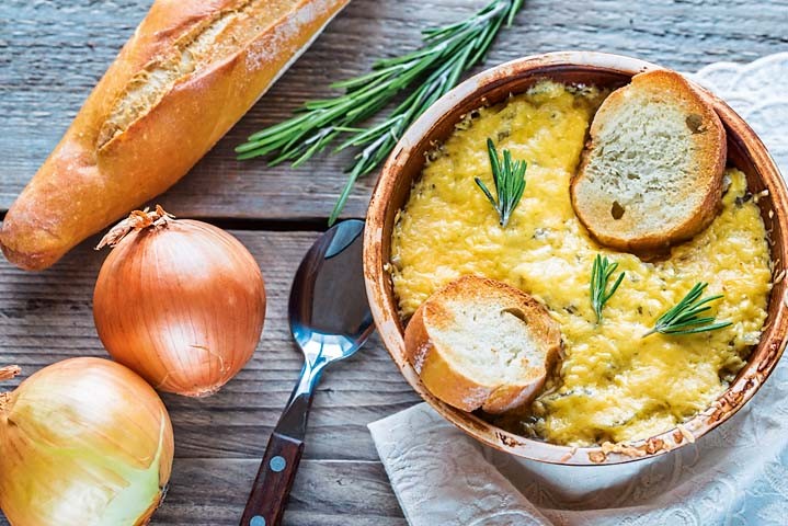 Еще одно крестьянское блюдо, которое сегодня подают в роскошных ресторанах. Готовится суп из лука, говяжьего бульона и сыра. Подают с чесночными гренками и украшением в виде тонкой сырной корочки.
