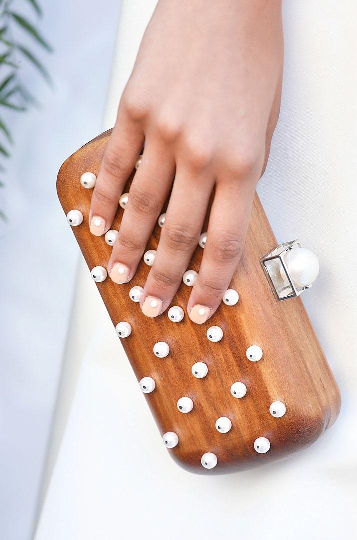Покрой ногти лаком телесного цвета в два слоя и на каждый у основания наклей жемчужную стразу.