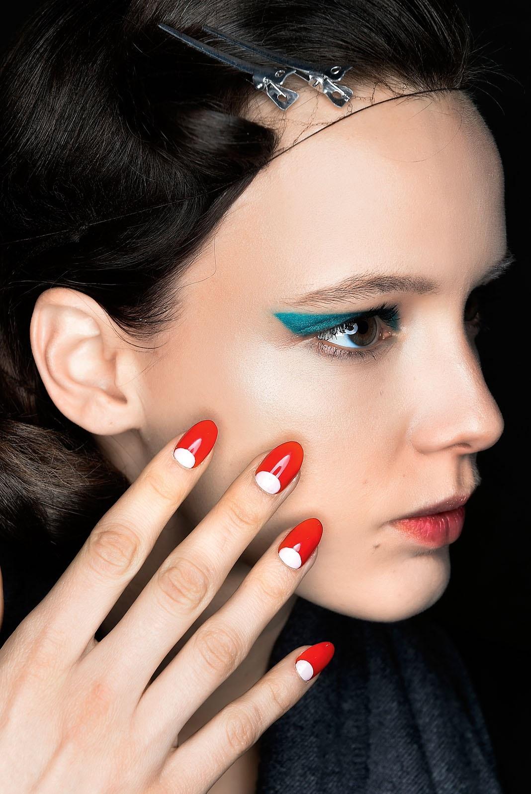 Растушуй матовые голубые тени в форме «вороньего крыла», сделай лунный красно-белый маникюр – и образ для встречи с подружками готов! Ну, или с прекрасным незнакомцем...