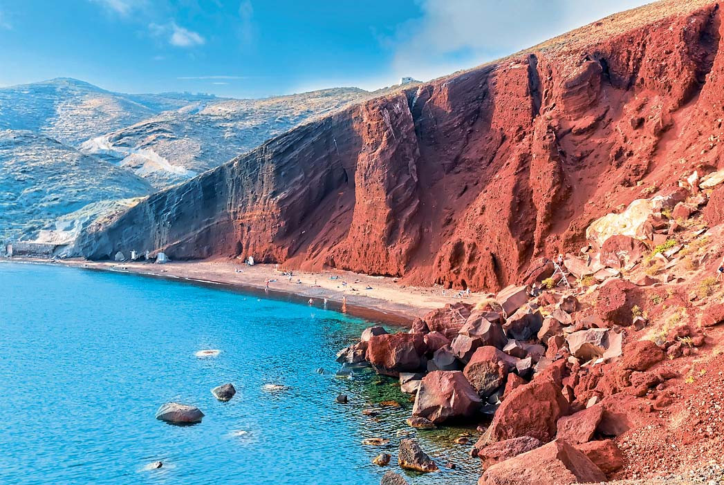 Пляж на греческом острове Санторини – результат сильнейшего извержения вулкана много тысячелетий назад. Интересный факт: песок здесь никогда не раскаляется под солнцем, но ходить по нему все равно неприятно из-за острых краев песчинок. Пляж оборудован зонтиками и шезлонгами, поэтому туристов здесь хватает.