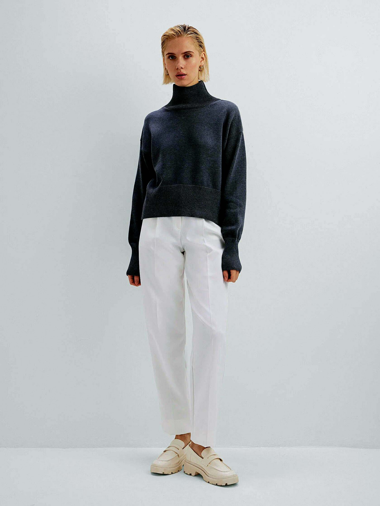 Многим покажется это сочетание слишком контрастным, но иногда такой контраст может сыграть тебе на руку. Рецепт стильного городского образа прост, как все гениальное: укороченный серый свитер + кипенно-белые джинсы. Дополнить все это великолепие рекомендуем черной сумкой-багетом и лоферами.
