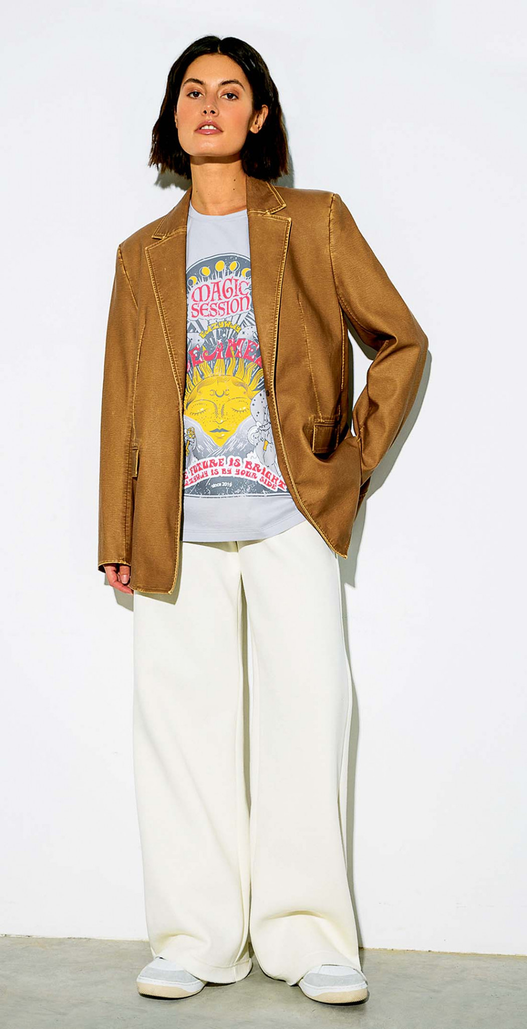 Неочевидное, но очень привлекательное сочетание. Низ – юбка или брюки – в этом случае пусть будет светлым и максимально спокойным. А дополнительные фэшн-баллы получишь, если найдешь футболку с принтом, повторяющим или дополняющим оттенок жакета.