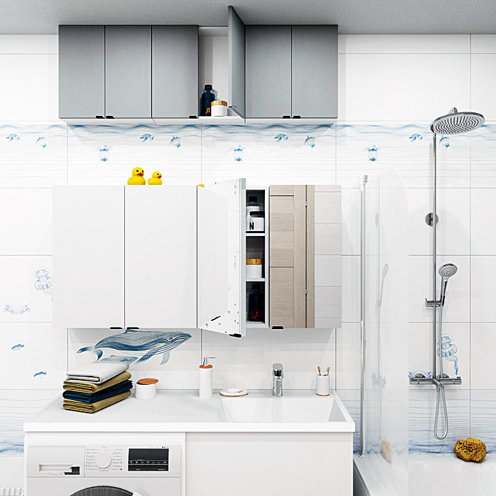 2. Шкафчик над раковиной. Иногда он имеет зеркальное покрытие, чтобы выполнять две функции разом, однако здесь встает вопрос уборки. Выбирай такой шкаф только при условии, что ты готова поддерживать его в чистоте, регулярно протирать средствами для зеркальных поверхностей, избавляясь от разводов. В противном случае лучше остановиться на обычном шкафчике, где зеркало расположено на внутренней поверхности дверцы, – это хотя и менее удобно, но значительно более аккуратно и гигиенично.