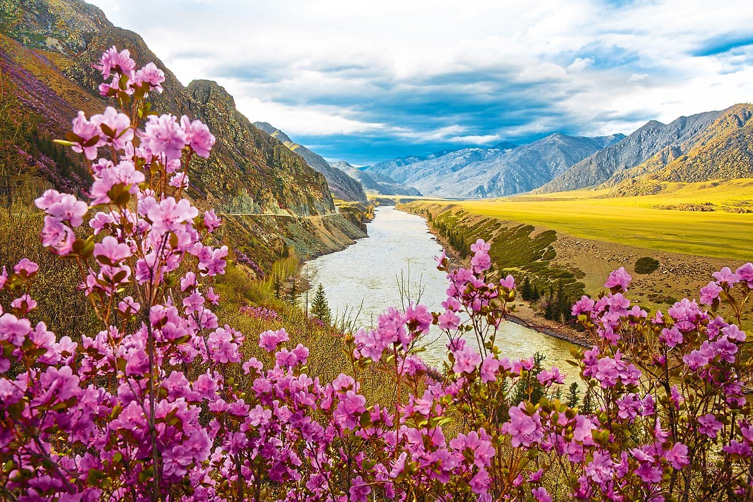 Особенно завораживающе эти места выглядят весной, когда цветет маральник. Так называют растение местные жители. Если понаучному, то это рододендрон Ледебура. Розовато-фиолетовые цветы маральника покрывают склоны гор и берега рек вдоль Чуйского тракта. Первые робкие цветы распускаются в конце апреля, а пик красоты приходится на начало мая. Знатоки утверждают, что самые впечатляющие виды открываются автомобилистам за перевалом Чике-Таман. Кстати, маральнику посвящен ежегодный праздник, который проводится в туркомплексе «Бирюзовая Катунь».
