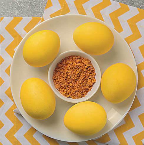 6. КУРКУМА. Придаст яйцам ярко-желтый цвет. В один литр горячей воды высыпи три столовые ложки куркумы, размешай. Погрузи туда яйца, оставь минимум на час.