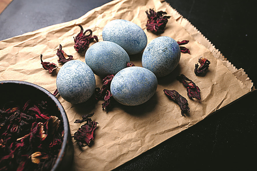 7. ЧАЙ КАРКАДЕ. Он окрасит яйца в красивый серый цвет. Возьми заварку, залей кипятком и опусти туда яйцо. Для светлого оттенка нужно держать не менее 30 минут.