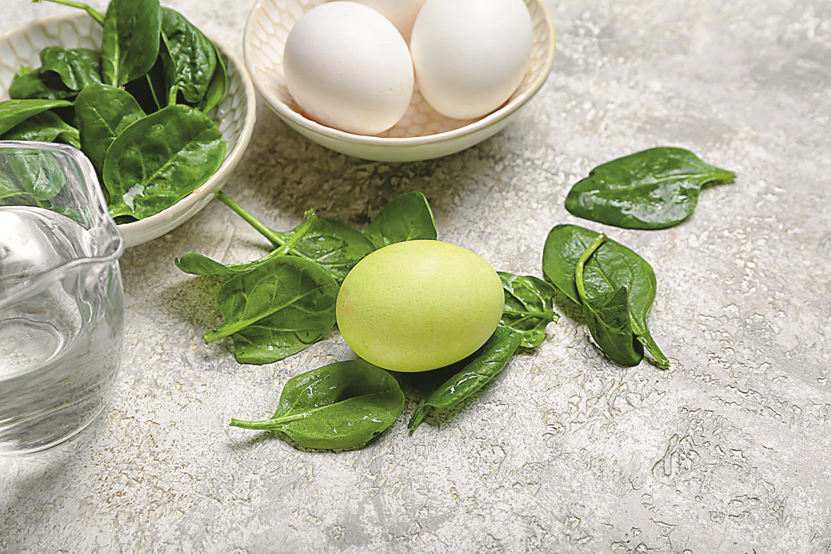 4. ШПИНАТ. Свежие листья пропусти через соковыжималку, затем отфильтруй через марлю. В полученное пюре опусти отваренные яйца, дождись окрашивания в нужный тон.
