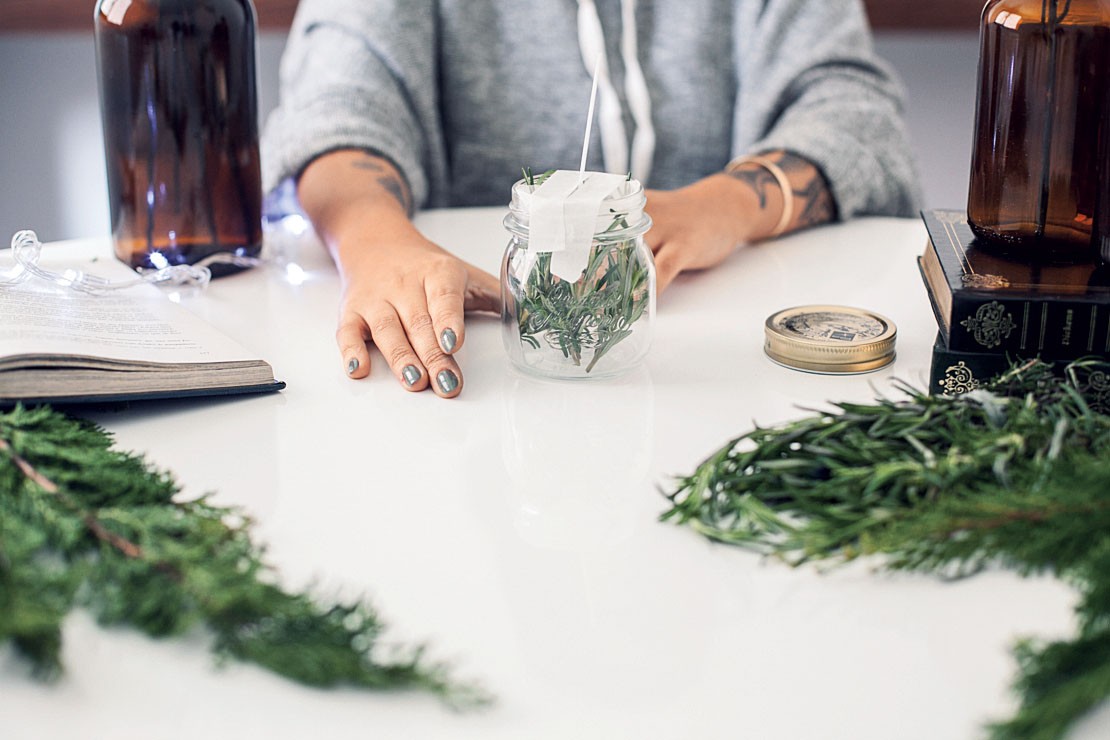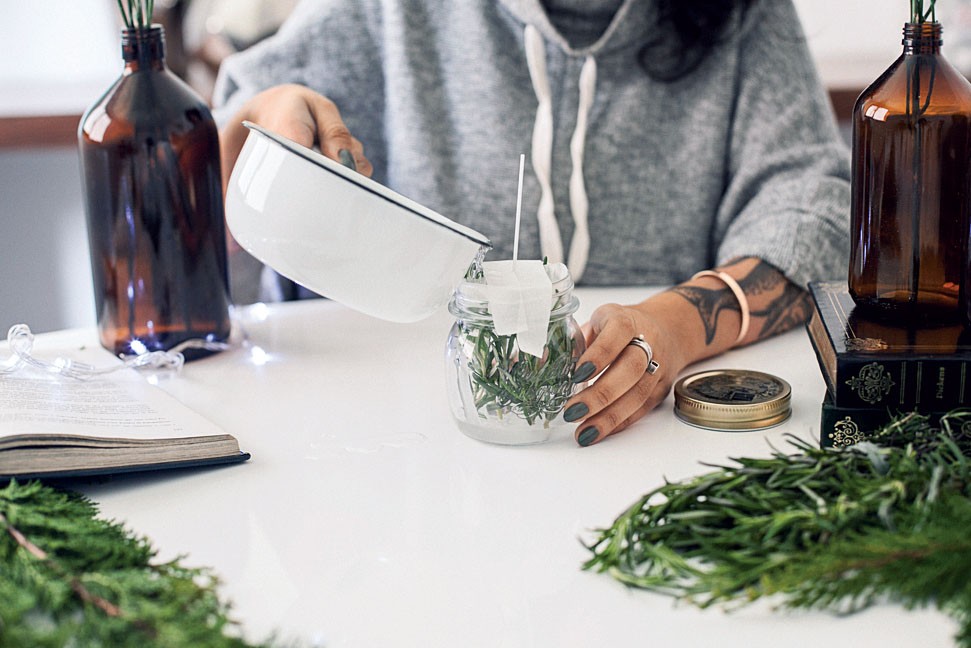 Пропитать воздух в доме запахом праздника поможет свеча с ароматом розмарина. Для ее изготовления понадобятся свечной воск, фитиль, стеклянная банка, ножницы, эфирное масло с ароматом розмарина и живые веточки растения.