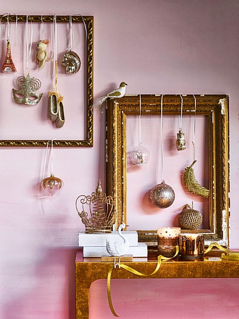 Подвесь елочные игрушки на рамы с помощью декоративных лент. Такие произведения искусства станут прекрасным украшением стены или консольного столика, и при этом не займут много места.