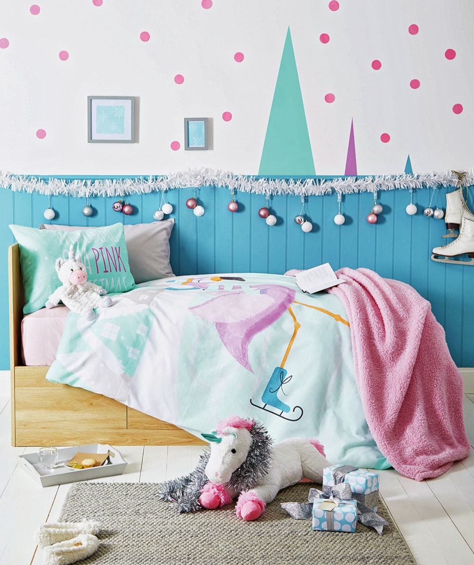 Свободные стены в помещении способны стать частью праздничной декорации. Укрась их яркими виниловыми наклейками с новогодними мотивами, например, с абстрактным изображением елки в виде треугольника и снежинок-кругов. А центр вертикальной плоскости подчеркни серебристой гирляндой с подвешенными на ней стеклянными шарами.