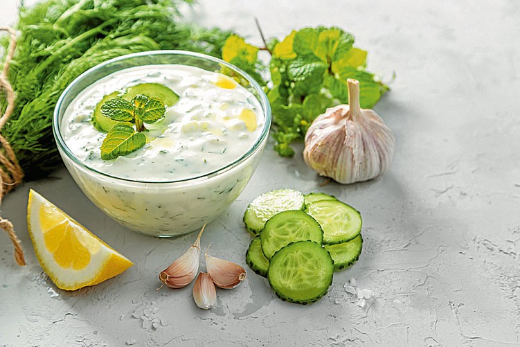 Ингредиенты: • 500 г натурального йогурта • 1 свежий огурец • 3-4 зуб. чеснока • 3 ст. л. растительного масла • 1 ст. л. мелко порезанного укропа • соль, перец по вкусу • 2 маслины