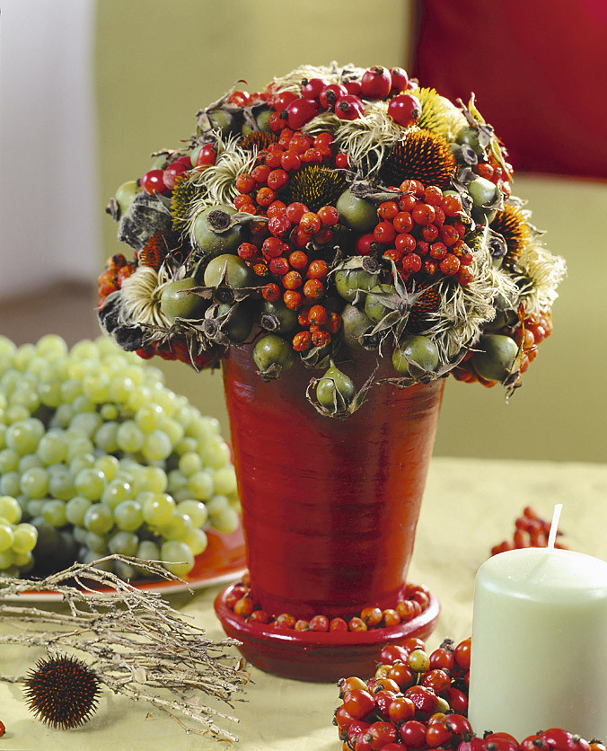 Ягодный букет. Если на участке растет земляника, ежевика или другая подобная ягода, можешь лакомиться ей – а часть собрать в букет. Зимой можно поставить в вазу веточки рябины с ярко-красными ягодами или желтой облепихи. Ягодные композиции великолепно смотрятся в кантри-интерьерах, на террасах, балконах и лоджиях. Правда, долго такой букет не простоит. Поэтому любуйся и параллельно подъедай «красоту», если она съедобна. А листья потом засуши и добавляй в чайные сборы.