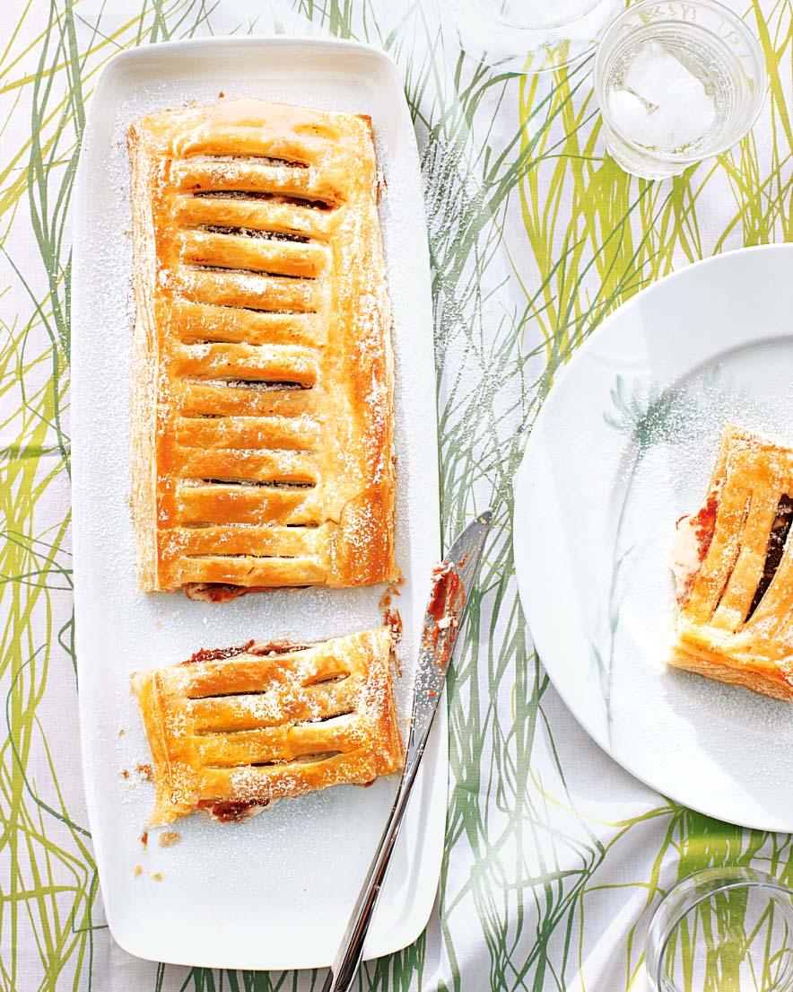 2. Тесто раскатать в прямоугольный пласт и разделить (наметить ножом) вертикально на 3 равные части. Среднюю посыпать сухарями и выложить начинку. Оставшиеся части разрезать на горизонтальные полоски и накрыть ими начинку. Края защипать. Верх смазать яйцом и выпекать при 180° около 30 мин.