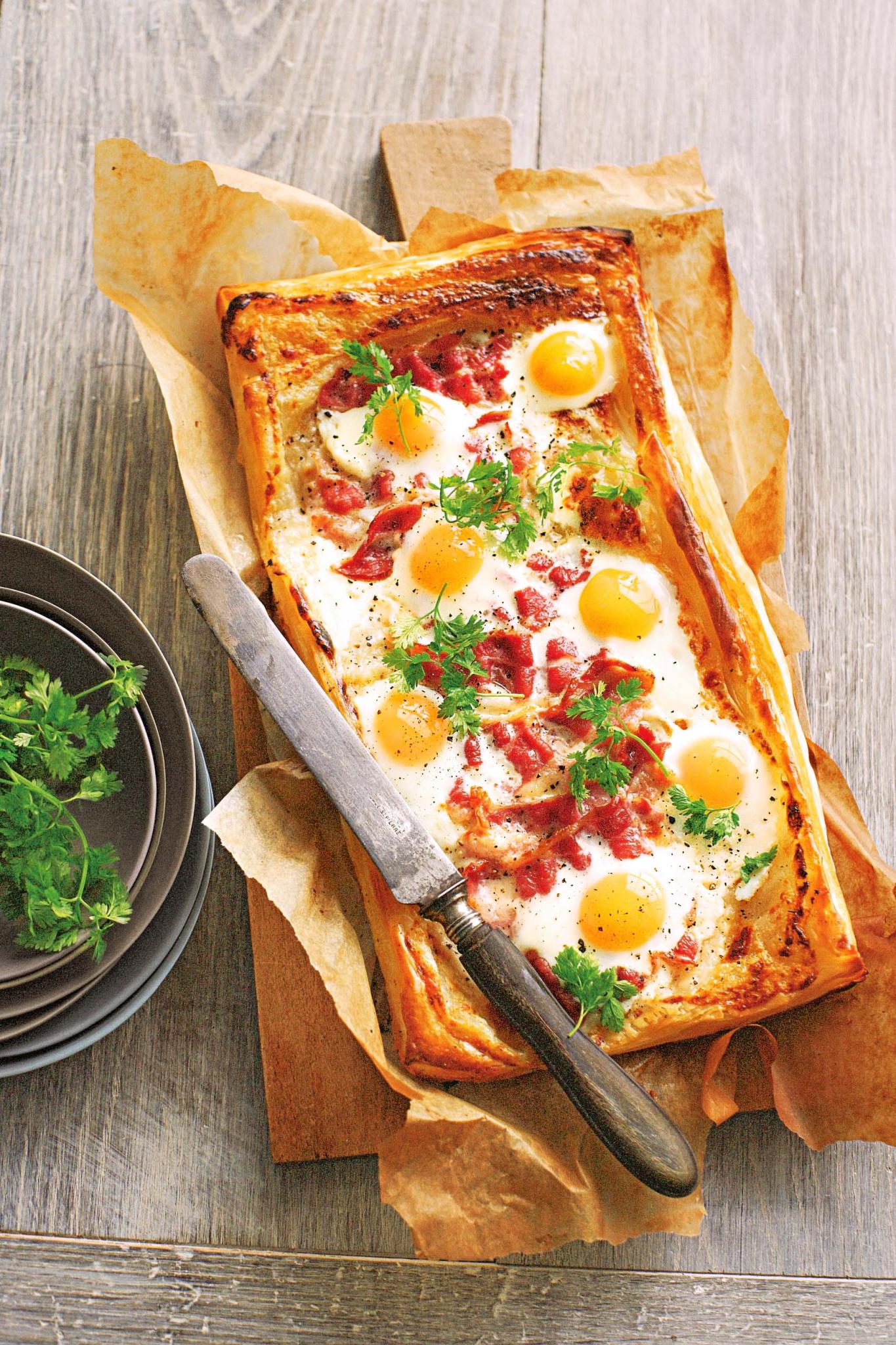 • 200 г замороженного слоеного бездрожжевого или дрожжевого теста • 80 г творога • 70 г сметаны • 1 желток • 150 г бекона • 50 г сливочного масла • 7 перепелиных яиц • листочки петрушки • соль • молотый черный перец
