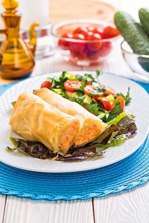 2. Тесто разрезать на 4 прямоугольника и смазать 2 ст. л. оливкового масла. Куски рыбного филе промокнуть бумажным полотенцем, выложить на листы теста и завернуть. Каждое изделие смазать 1/2 ст. л. оливкового масла и выпекать при 180° около 15 мин.