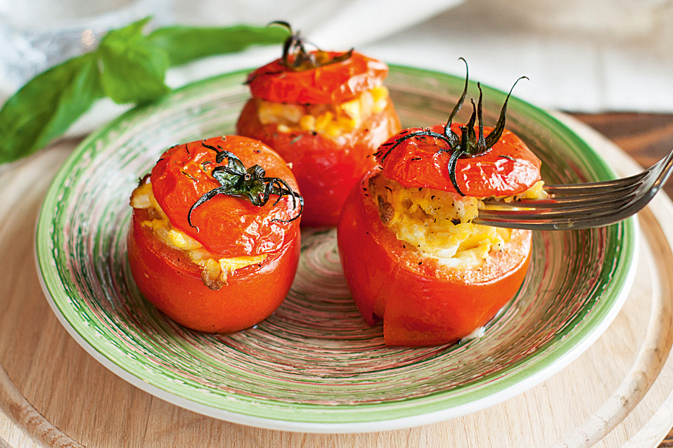 Аккуратно срежь с помидоров верхушки. Маленькой ложечкой достань сердцевину. Натри сыр и взбей его с яйцом и рубленой зеленью. Добавь соль, перец и помести начинку в помидоры. Закрой их верхушками, как крышечками, и запекай помидоры в микроволновке 3–4 минуты.