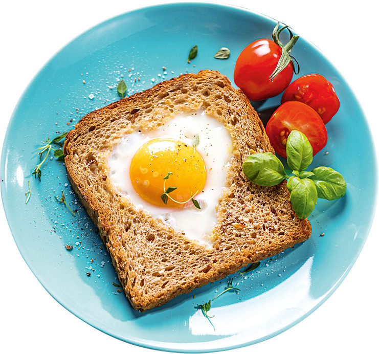 С помощью рюмки или металлического формовочного кольца сделай круглое отверстие в мякише хлеба. Смажь сковороду сливочным маслом и обжарь хлеб – 30 секунд с каждой стороны. Затем разбей в центр хлеба яйцо, посоли, поперчи, посыпь зеленью и жарь, пока не схватится белок.