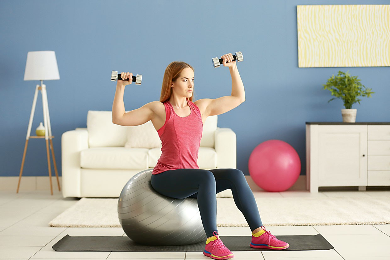 Сядь на фитбол или стул, слегка прогнись в пояснице. На выдохе подними гантели (неспешно, без рывка). На вдохе медленно опусти. Важно, чтобы руки двигались по одной линии, поэтому разворачивать ладони нельзя. Повтори упражнение 25–30 раз.