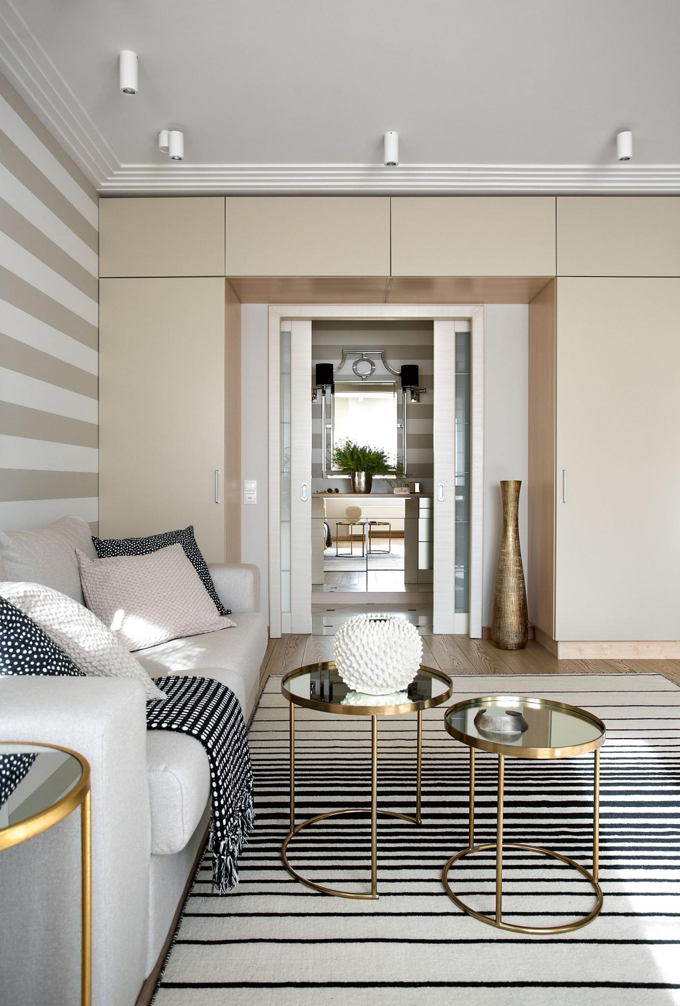 Это все те самые, знакомые нам с детства «антресоли» – секции потолочного шкафа, встроенные в высокую потолочную часть. Несмотря на то что это решение может показаться довольно старомодным, и его можно обыграть. В первую очередь, за счет стильных дверок с оригинальными ручками. Важно: если захочешь выбрать этот вариант, помни, что «антресоли» должны быть расположены на высоте не ниже 2 м. от поверхности пола (чтобы не мешать проходу). И очень удобно, когда их внутренняя часть разделена на отделения (полки) – так намного легче поддерживать порядок.
