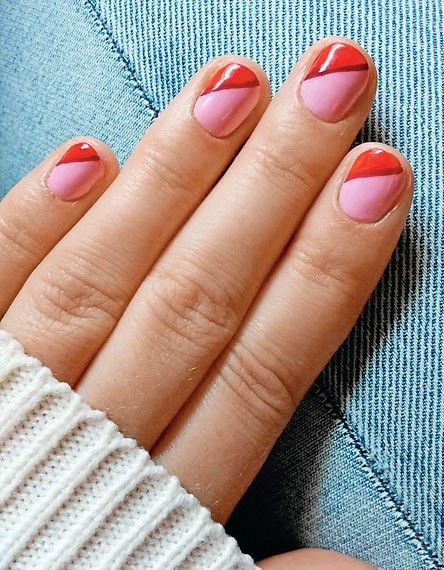 Как тебе идея геометричного маникюра? Нанеси на ногти розовый лак. Отдели кончик скотчем по диагонали и закрась его красным. Получилось не совсем ровно? Не переживай! Защитное покрытие все скроет.